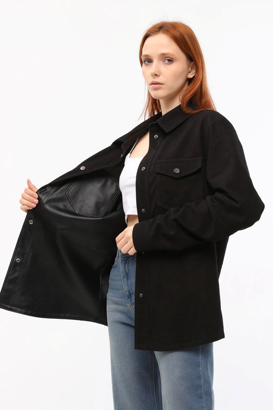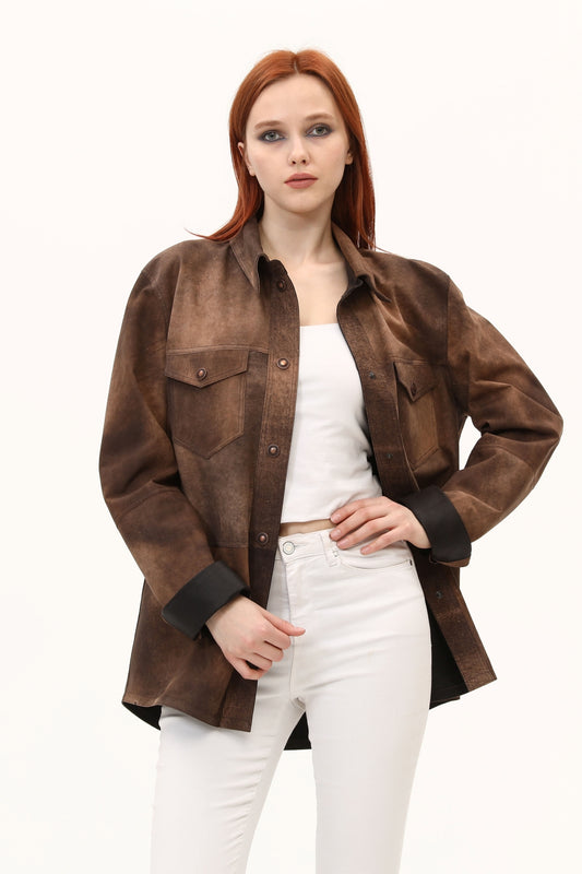 Bakır Eskitme Oversize Kadın Deri Gömlek