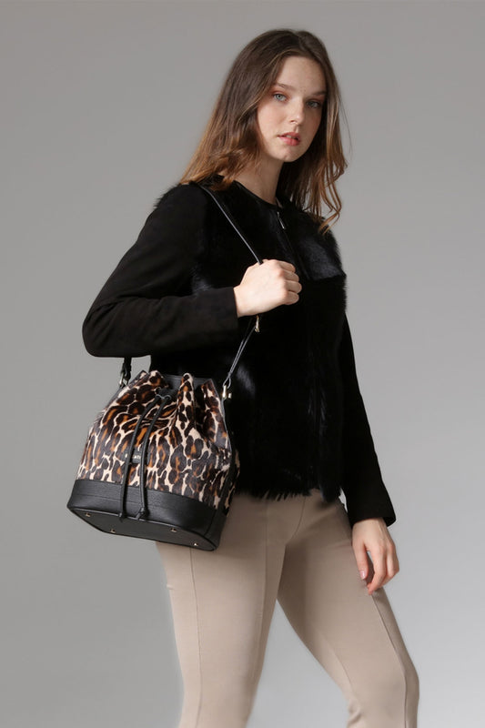 Siyah Kadın Leopar Baskılı Torba Deri Çanta