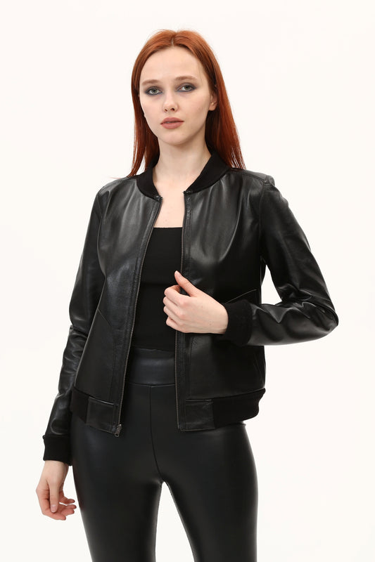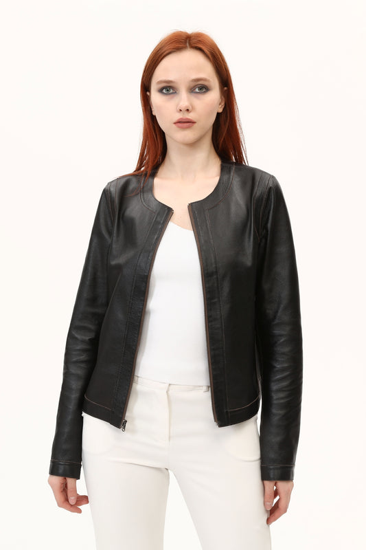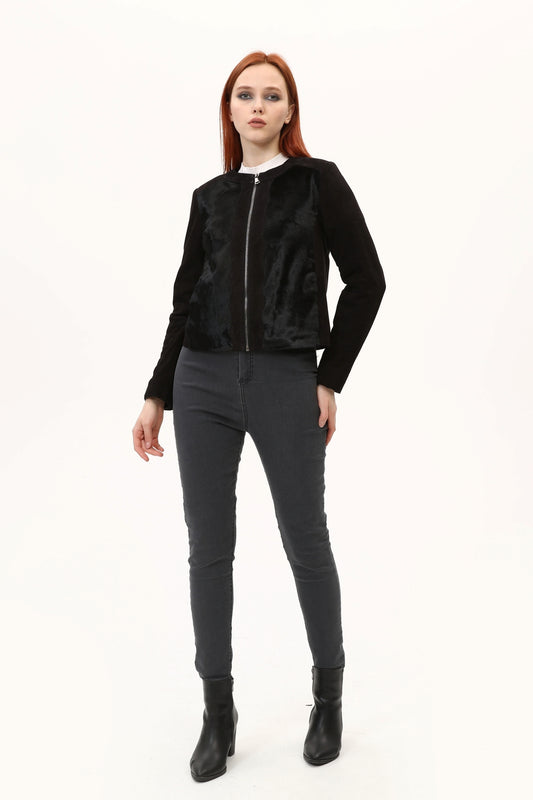 Siyah Kadın Fit Deri Ceket (Çift Taraflı)