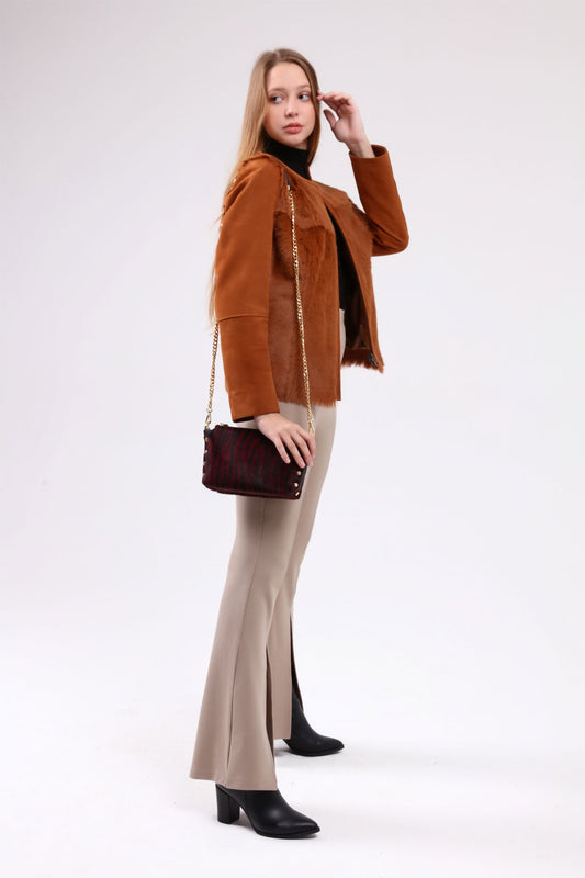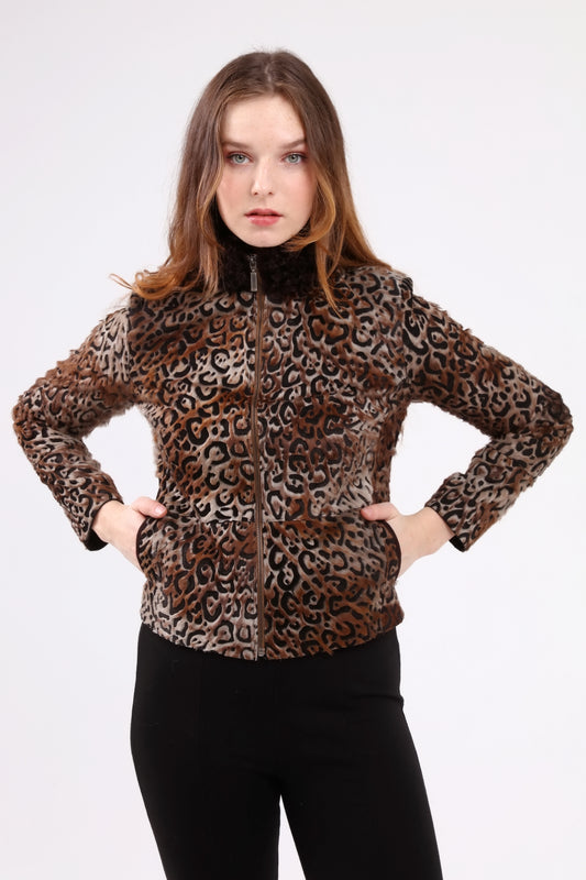 Kahverengi Kadın Leopar Desenli Deri Ceket