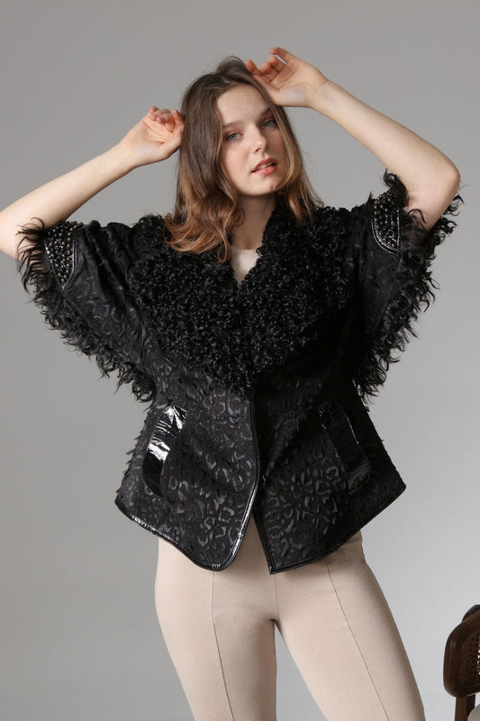 Siyah Kadın Leopar Desenli Deri Ceket